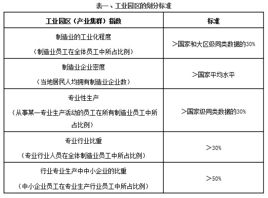 1993年4月,意大利工業部對工業園區的劃分標準進行了具體規定。見表一。
