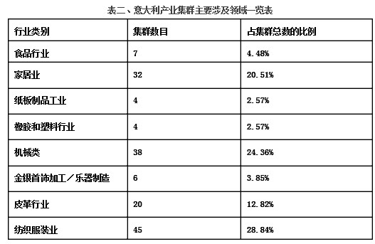 意大利的產業集群多集中在傳統輕工業領域,主要行業及所占比例見表二。
