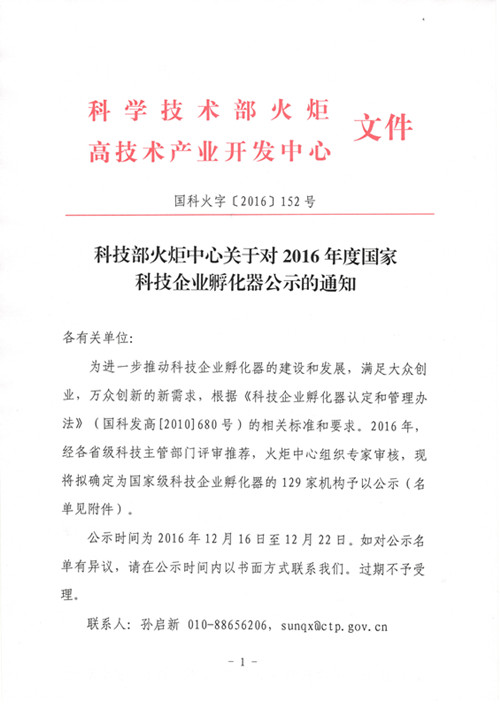 科技部火炬中心關于對2016年度國家級科技企業孵化器公示的通知
