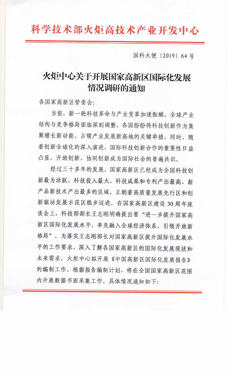 火炬中心關(guān)于開(kāi)展國(guó)家高新區(qū)國(guó)際化發(fā)展情況調(diào)研的通知